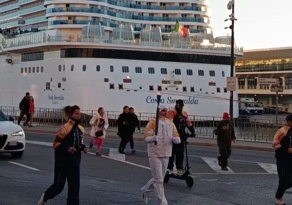 Olympic Torch Passes Next to Cruise Ship in Savona
