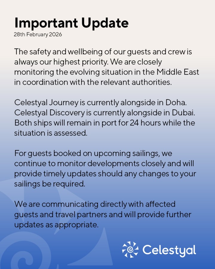 Celestyal Cruises confirmed both of its Gulf based ships, Celestyal Journey in Doha and Celestyal Discovery in Dubai, will remain in port for at least 24 hours while the situation is assessed.