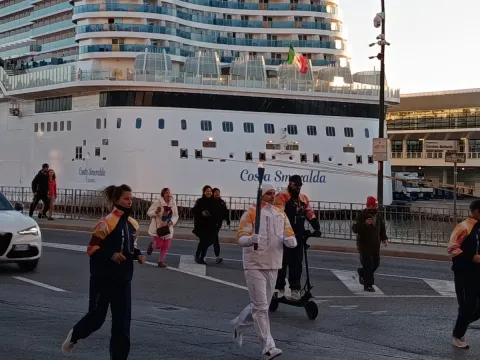 Olympic Torch Passes Next to Cruise Ship in Savona