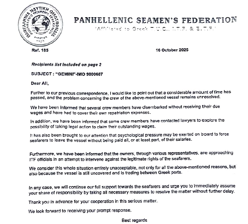 I am writing to inform you that the crew members onboard the MV Gemini, operated by Miray Cruises, have not been paid for up to four months. The company has provided no clear information or updates regarding the delayed payments, and the situation is becoming increasingly difficult for everyone onboard.
